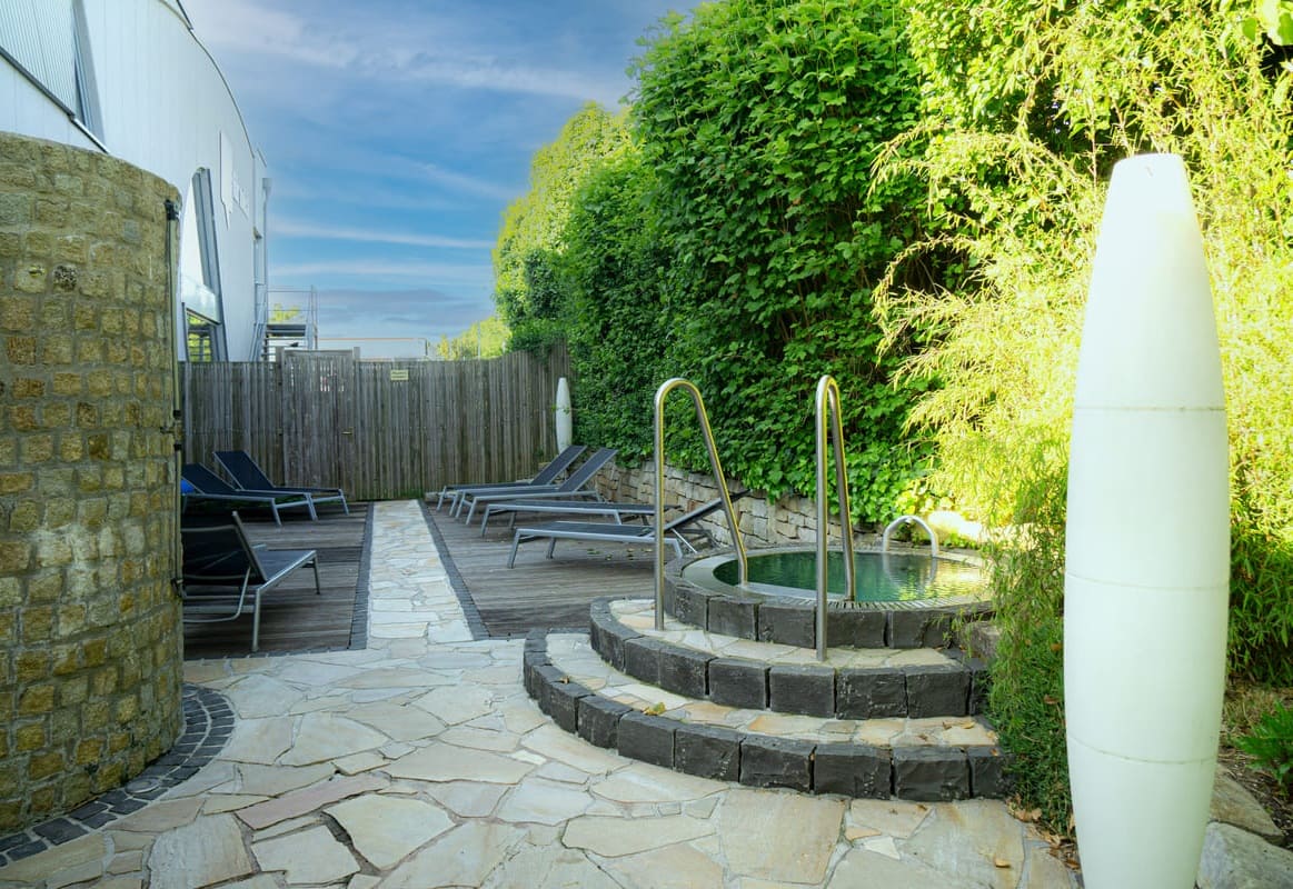 Entspanne dich in unserem großen Saunagarten mit Ruheflächen und Tauchbecken und tanke neue Energie.