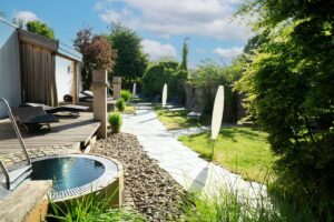 Entspanne dich in unserem großen Saunagarten mit Ruheflächen und Tauchbecken und tanke neue Energie.